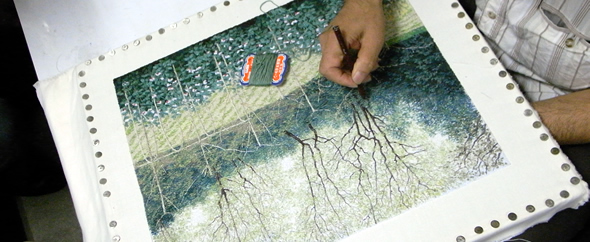 刺繍布に文化刺繍針で文化ヤーンを刺していく技法は、